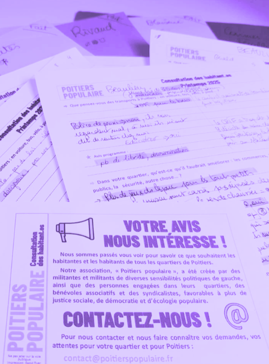 Le 7 février 2025, nous avons créé l’association Poitiers Populaire, pour aller à la rencontre des habitantes et des habitants. Nous sommes convaincus que pour gagner les élections municipales, la gauche doit répondre aux besoins et aux demandes de la population, en tirant les leçons des avancées et des limites de l’action conduite par la municipalité actuelle, et des impasses de la municipalité précédente. Immédiatement, nous nous sommes adressés à toutes les forces de gauche pour discuter d’un projet commun, en rupture avec les politiques antisociales, antiécologiques et autoritaires que l’on voit se développer en France et dans le monde.